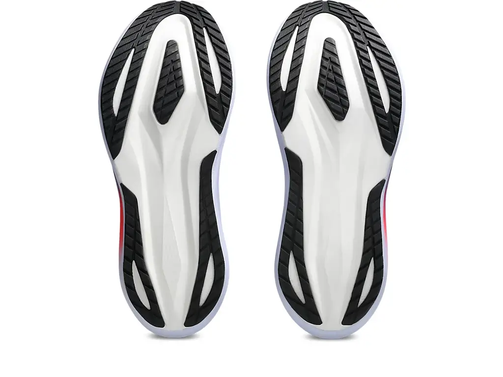 ASICS Megablast futócipő külsőtalpAz ASICS Megablast futócipő külsőtalpa ASICSGRIP gumikeverékből készült, aminek nagyon jó a tapadása. A külsőtalp nem fedi le a teljes középtalpat, de gyakorlatilag egy gyűrűt alkot körbe a középtalpon, ami stabilitást, tartást ad az egyébként nagyon puha középtalpnak. Hogy hajlékony maradjon a cipő, a középső részen mindkét oldalon van egy-egy kivágás. Annak ellenére, hogy kicsi a tapadási felület, nagyon jó a tapadása a cipőnek, ami már a hangjából is érződik, nagyon erősen belekapaszködik a talajba.