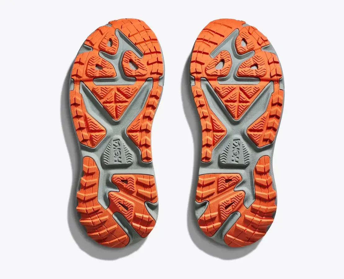 A Hoka HOKA Stinson 7 terepfutócipő külső talpa nem fedi le a teljes középtalpat, ami terepfutó cipőknél nem megszokott. Mivel széles a cipő talpa, tapadás szempontjából kellő mennyiségű a külső talp, de védelem szempontjából jobb, ha lefedi a teljes középtalpat. A külső talp Vibram talp, puha és különböző mintázatú barázdák és gumitüskék vannak rajta. A külsőtalp egy átmenet az utcai és terepfutócipő között. Bár jó a tapadása, de nedves, saras terepen, sziklákon nem ad elég tapadást, ezért inkább csak könnyebb terepeken ajánlott benne futni.